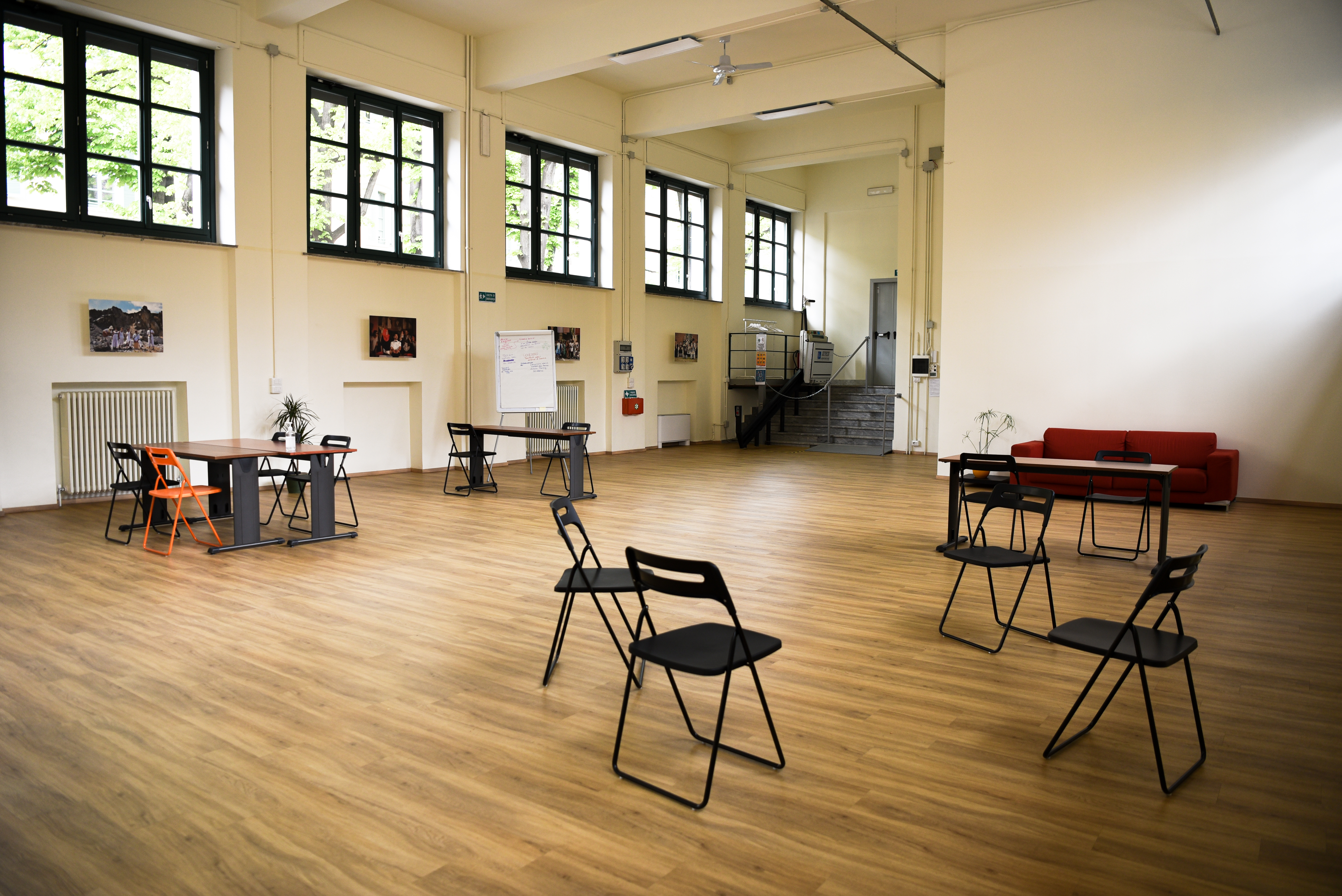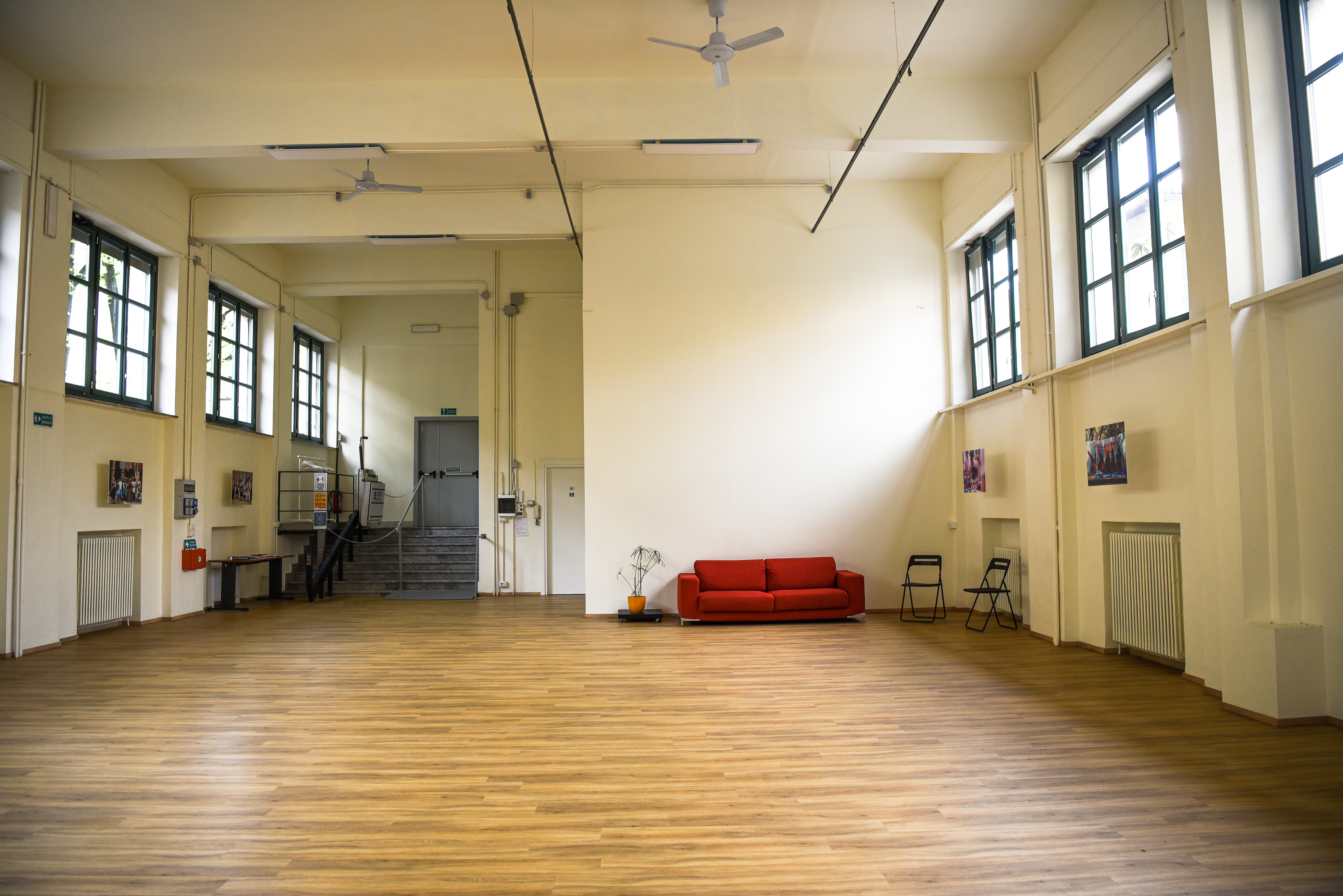 La sala grande è uno spazio ampio e luminoso, adatto alle attività di gruppo, alle prove teatrali, a convegni e seminari. Può essere utilizzata vuota oppure allestita con tavoli e sedie e può ospitare fino a 99 persone.